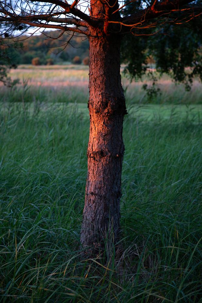 Some pink light is coloring this pine tree this evening.